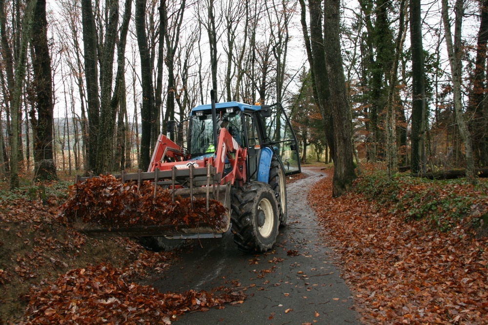 Le tracteur en haut du sentier la mâchoire pleine de feuilles mortes ramassées le long du fossé pour éviter qu'elles ne le bouchent.