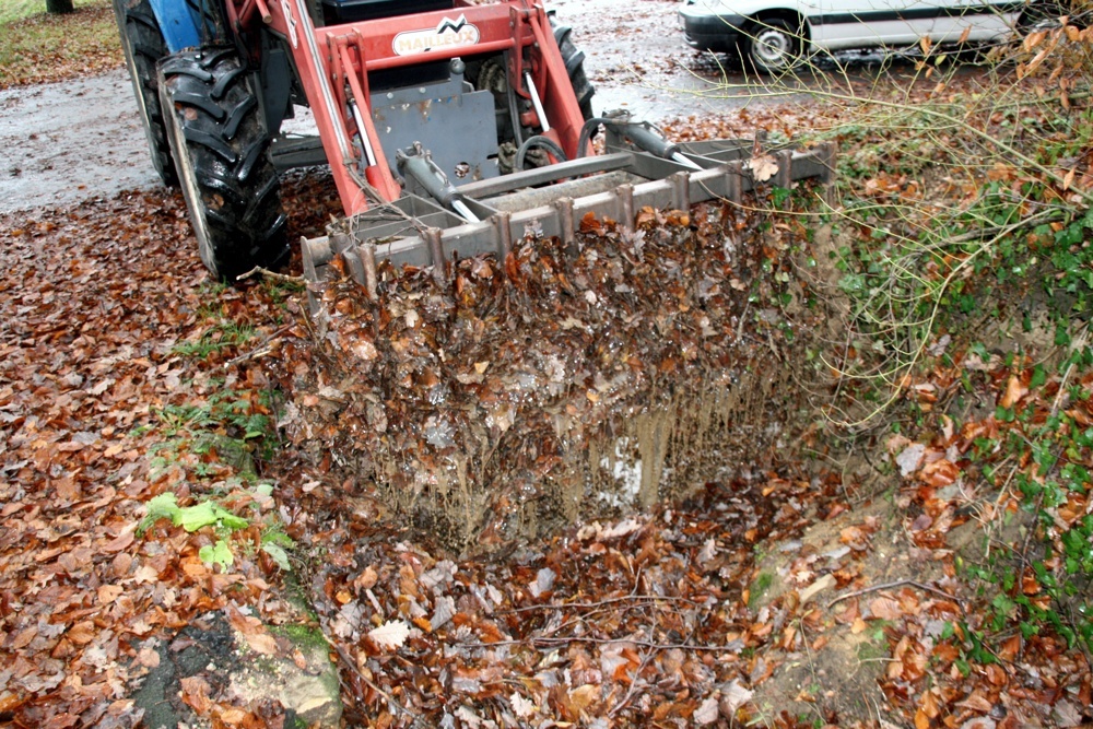 La mâchoire du tracteur remplie de feuilles mortes qui bouchent le fossé du sentier forestier situé à coté des chalets de Waldighoffen.