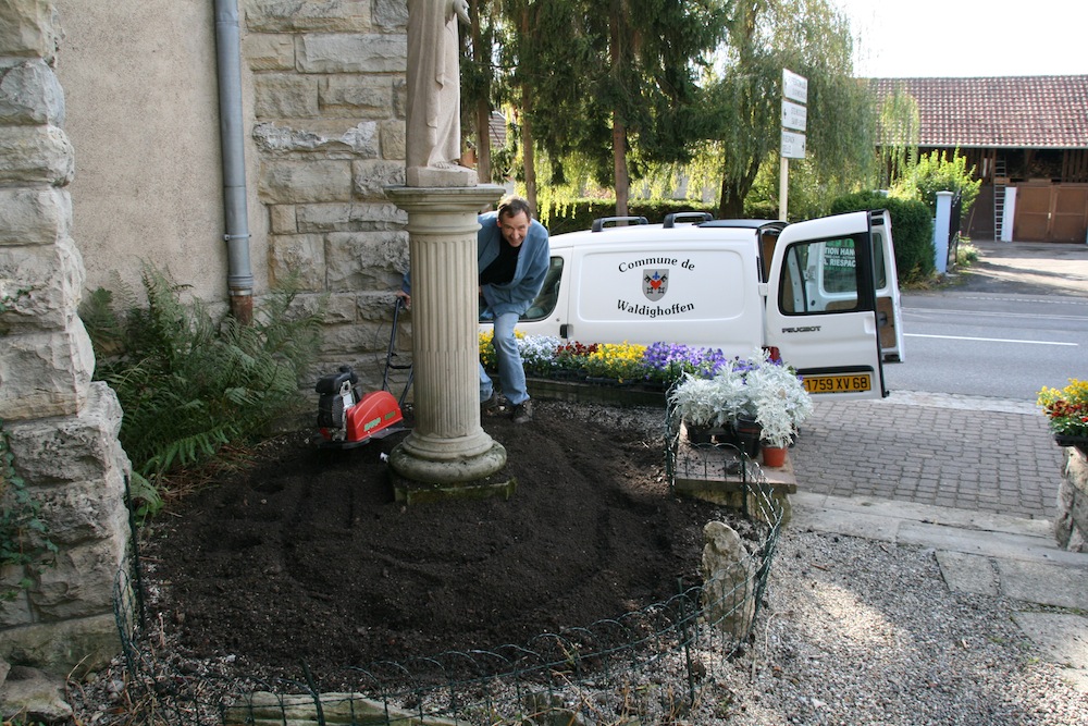 Vous êtes ici : Accueil WALDImag Waldighoffen en images Les photos des travaux des ouvriers communaux de Waldighoffen Motoculteur autour d'une statue - amusement