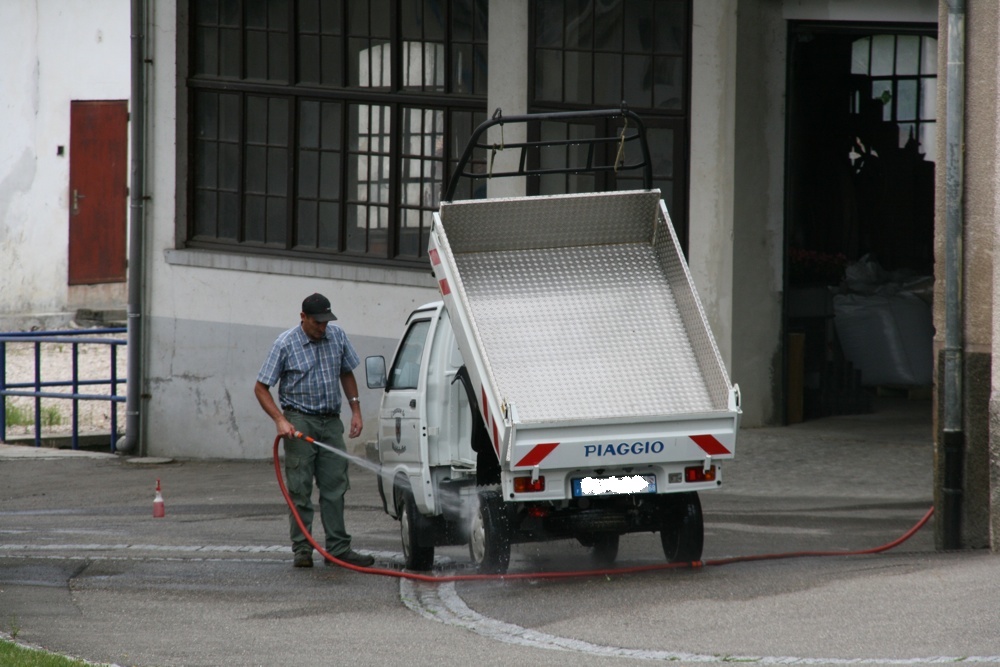 Christian pendant le nettoyage du Piaggio de la Commune de Waldighoffen devant les ateliers municipaux.