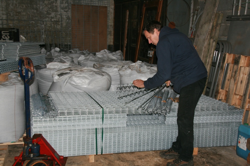 Philippe penché sur les grilles à gabions dans l'atelier communal de Waldighoffen.