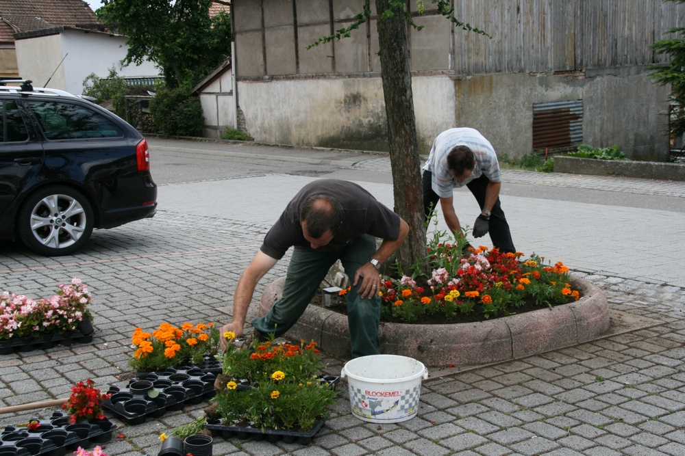 Les ouvriers communaux Philippe et Pascal travaillent d'arrache-pied au fleurissement de la Commune de Waldighoffen.