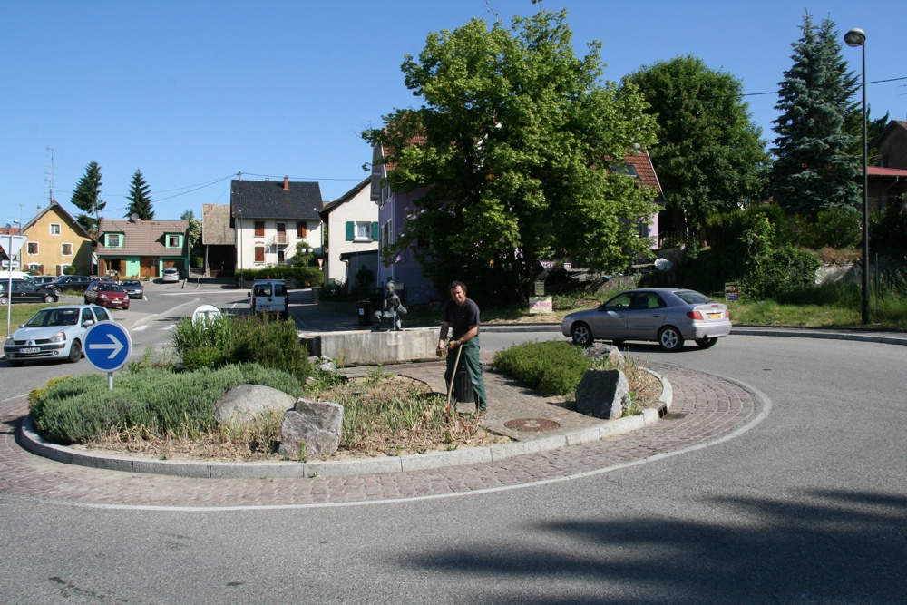 Jardinage sur le rond-point de la Communauté de Communes Ill et Gersbach de Waldighoffen par les ouvriers communaux.