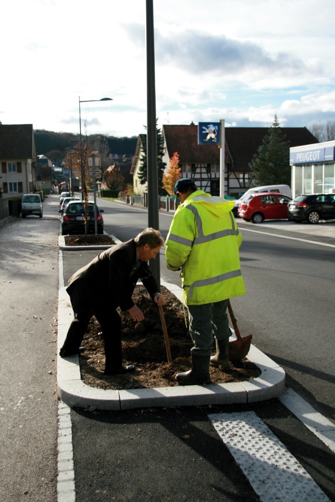 Christian et Monsieur EGGENSPIELER préparant le trou pour l'arbre planté rue du 19 novembre à Waldighoffen le 9 novembre 2010.