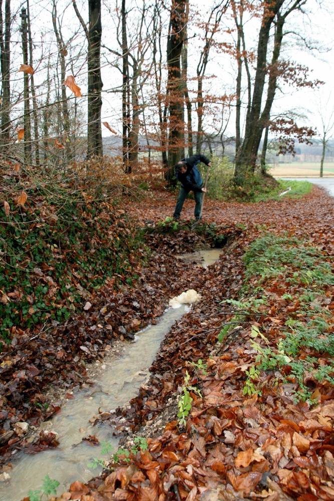 Le ratissage manuel des feuilles mortes dans la forêt de Waldighoffen