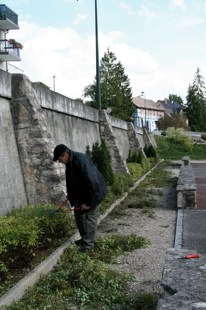 Philippe en train de tailler les haies sur la parking du site Lang à Waldighoffen, le long de la rue du moulin.