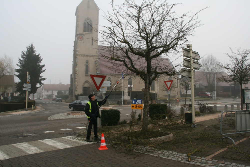 Philippe Schmidlin responsable des ouvriers communaux de Waldighoffen entrain de procéder à l'élagage des arbres sur la place de la mairie.