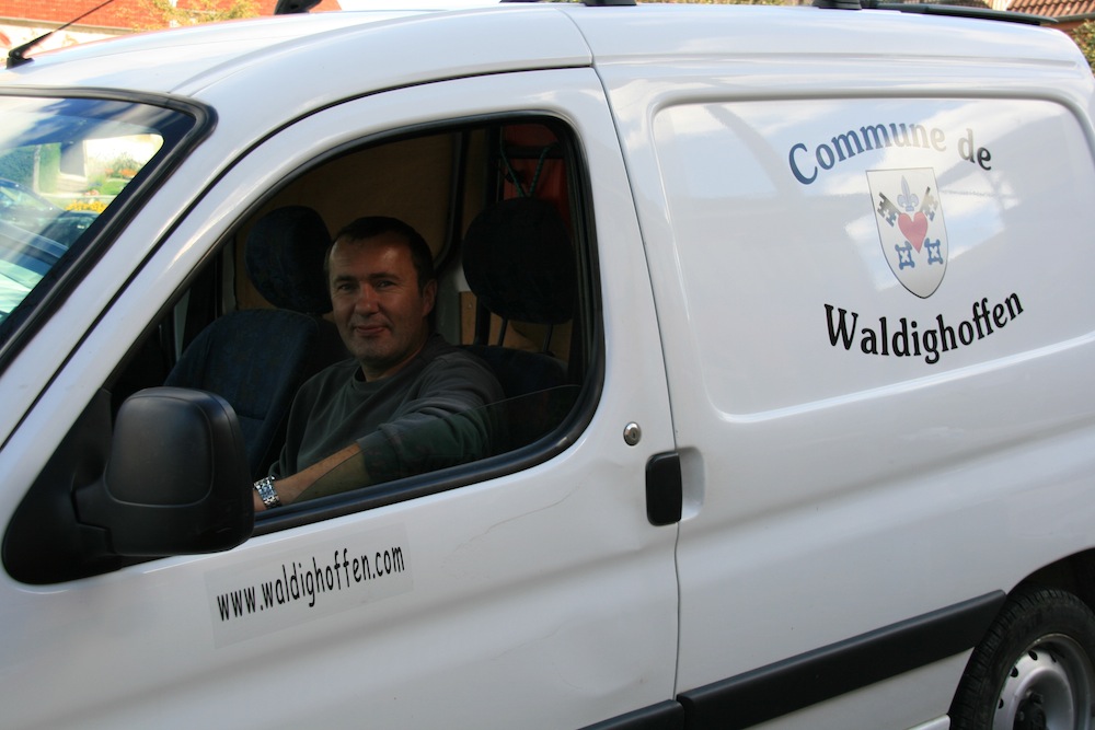 Photo de Pascal, ouvrier communal à Waldighoffen au volant de l'utilitaire qui porte maintenant l'adresse du site Internet sur les portières.