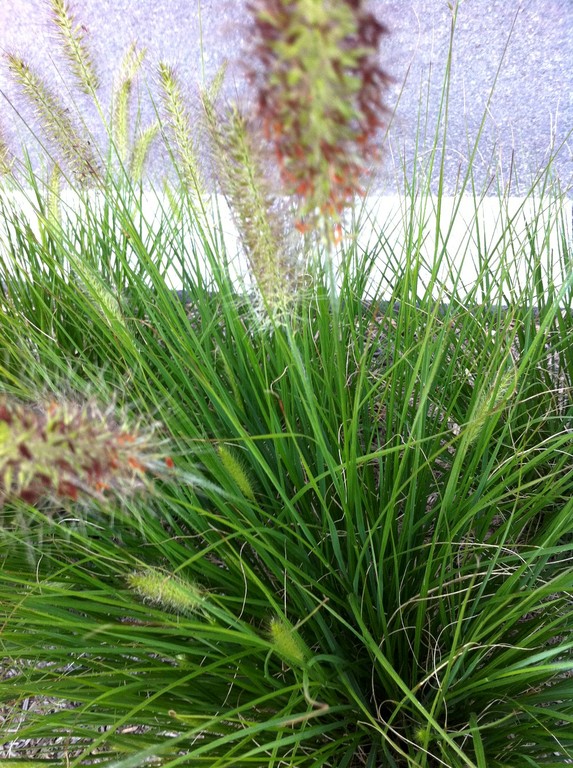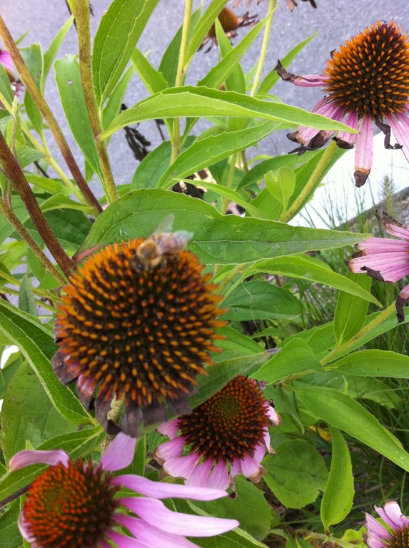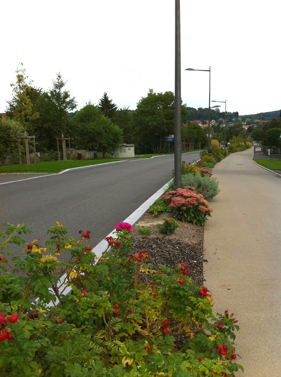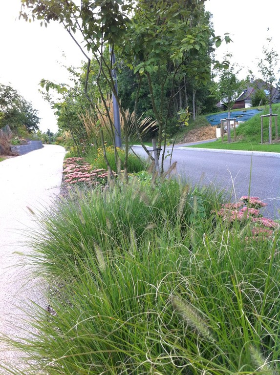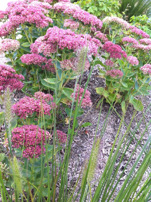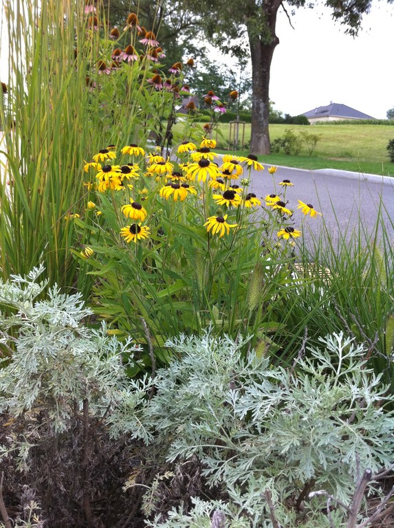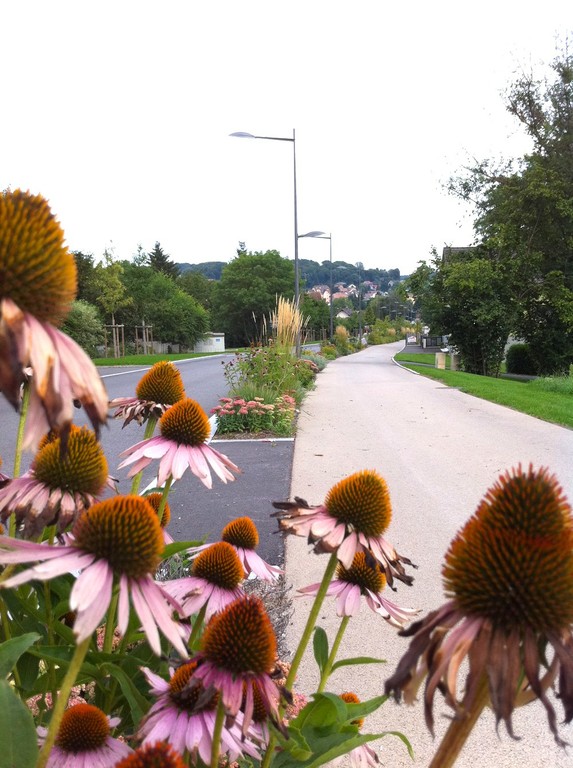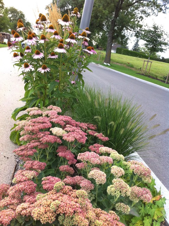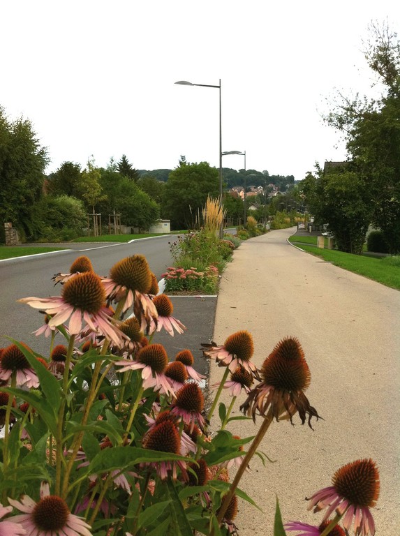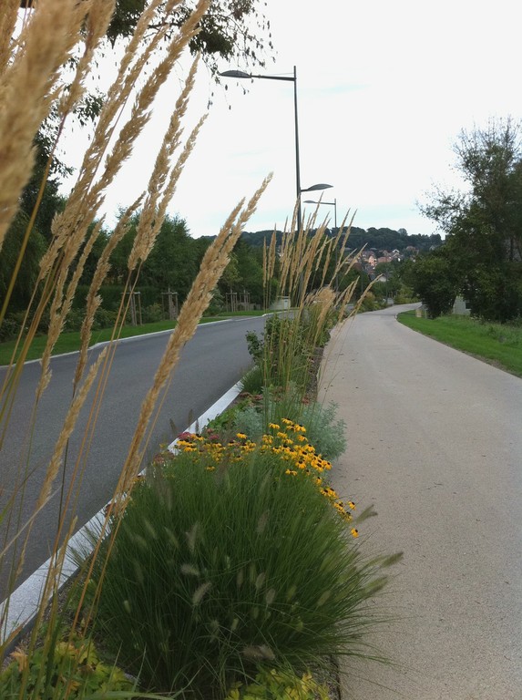 La rue du 19 nov : les sédum, les pennisétum (graminées) et les echinacéas