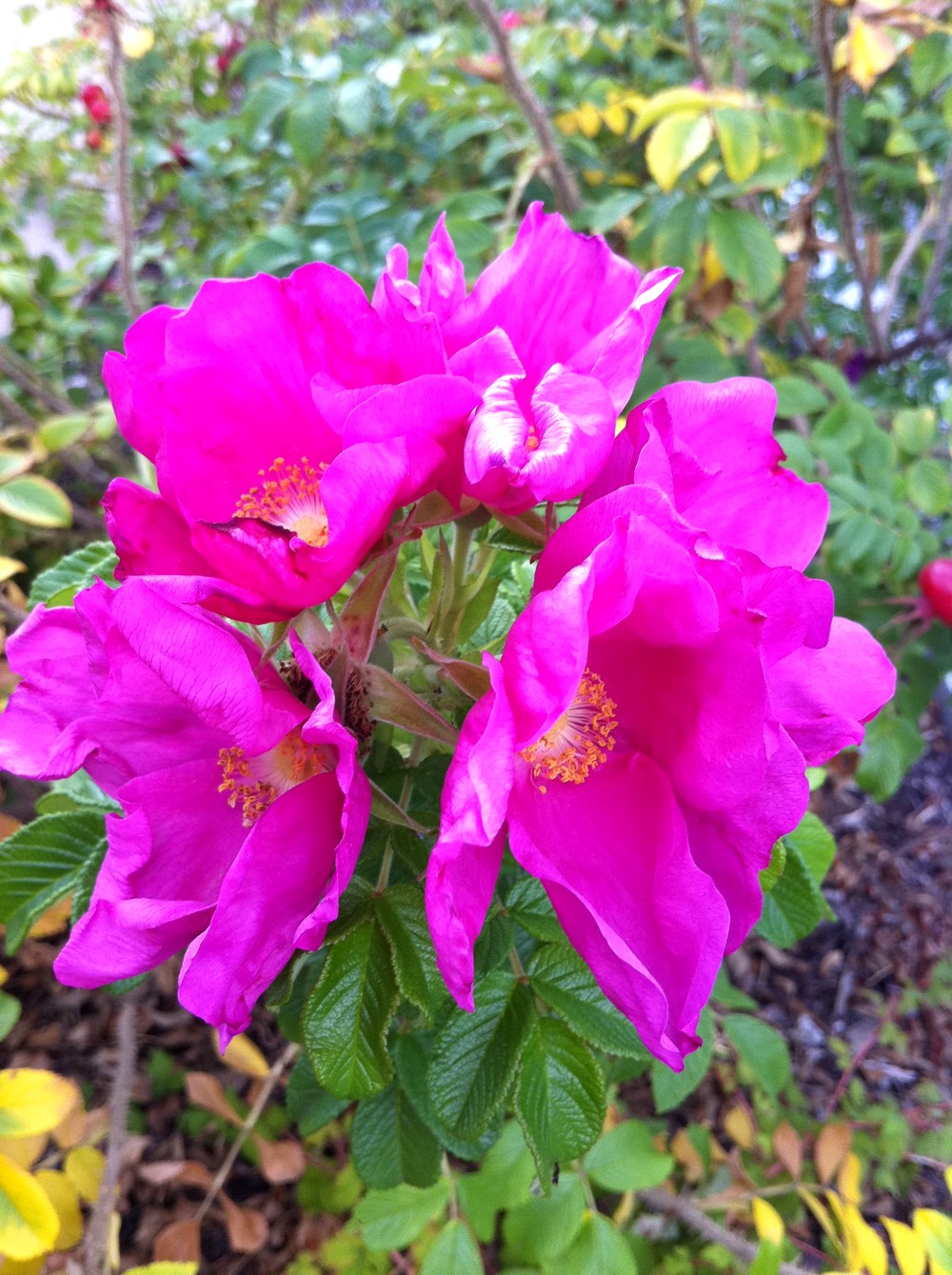 Arbuste souvent utilisé au bord des routes, le -Rosa rugosa- est beau actuellement avec ses fleurs et ses fruits
