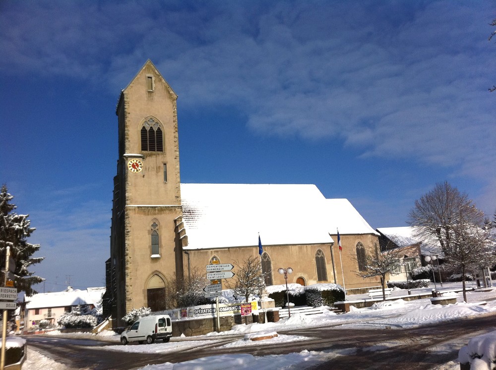 Ciel bleu et Eglise de Waldighoffen enneigée