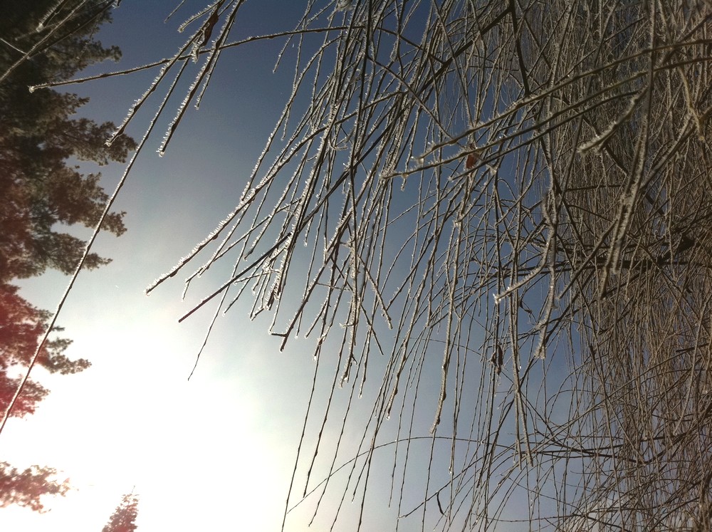Début janvier 2011, la lumière traverse des branches givrées d' un saule pleureur.