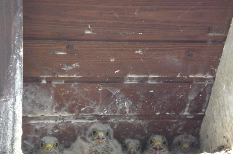 Les 5 bébés faucons crécerelle alignés sous un toit à Waldighoffen - le 26/06/2011